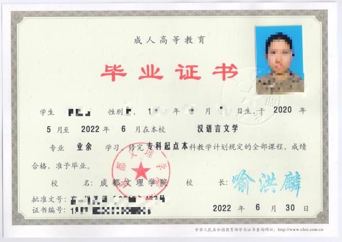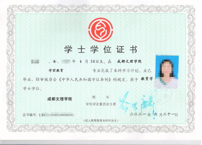 学生在规定的修业年限内,修完教育教学计划规定内容,成绩合格,达到学校毕业要求的,学校准予毕业,由成都文理学院颁发国家承认学历的成人教育本、专科毕业证书。