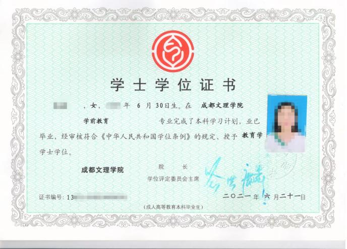 学生在规定的修业年限内,修完教育教学计划规定内容,成绩合格,达到学校毕业要求的,学校准予毕业,由成都文理学院颁发国家承认学历的成人教育本、专科毕业证书,本科层次达到学位标准的经本人申请可颁发成人教育学位证书。学历文凭及学位证书在学生毕业时由学校按照教育部对成人教育的有关规定,实行教育部高等教育学历文凭电子注册,国家予以承认,学信网可查。