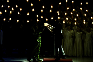 舞台上伴随着钢琴轻快灵动的弹奏,合唱团将《有我》中极具历史的歌词以歌唱的方式娓娓道来,层层递进将青年一辈的赤子之心展现得淋漓尽致,伴随舞蹈的出现,他们优美的舞步和充满活力的动作与激昂的歌词融为一体。