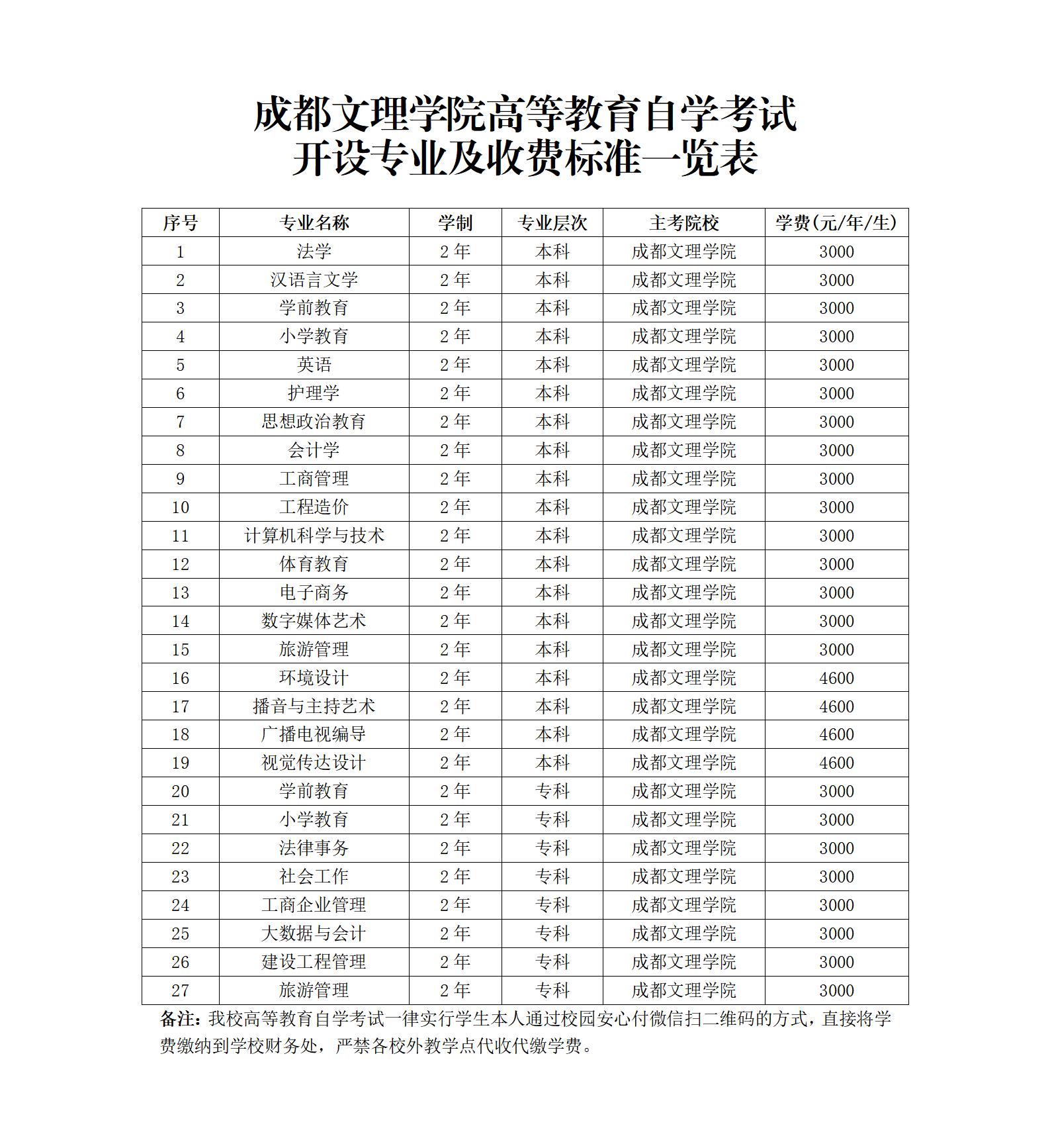 成都文理学院高等教育自学考试开设专业及收费标准一览表