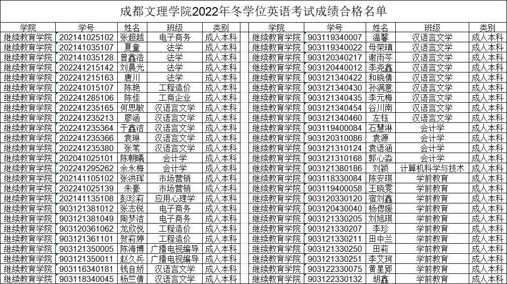 继续教育学院自考本科考生2022年冬季缓考学位英语合格名单公布如下,如有疑问请致电:02861565068。